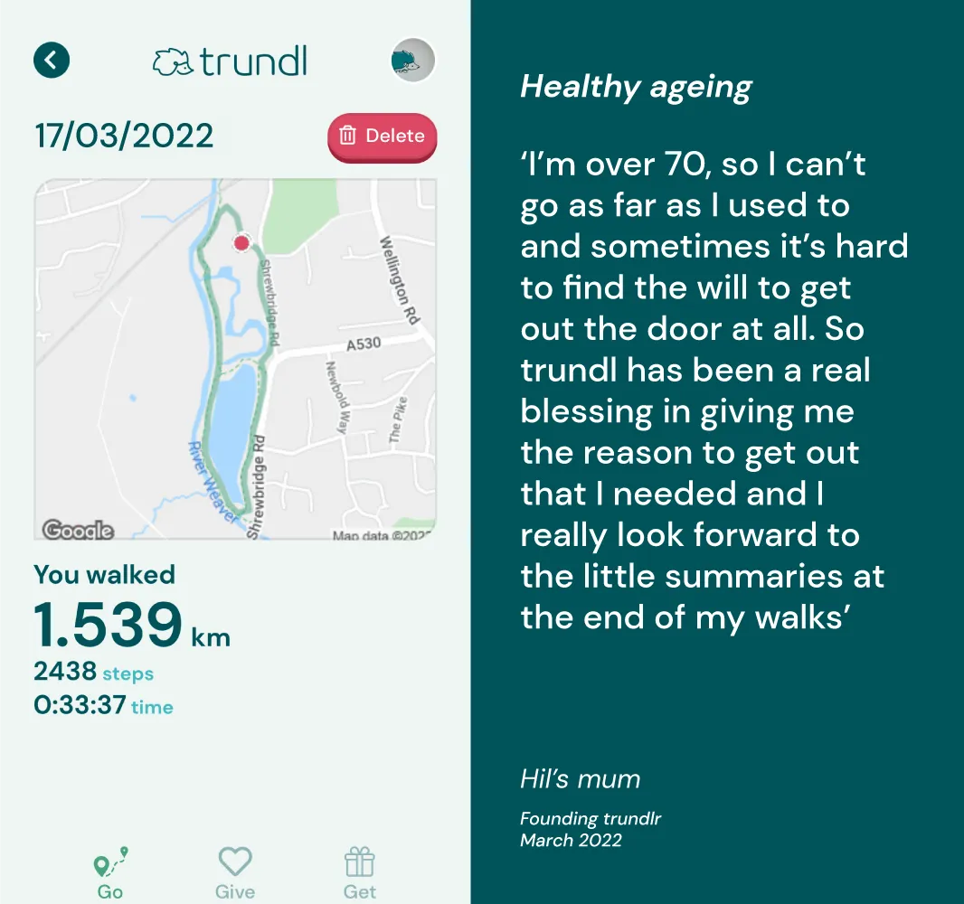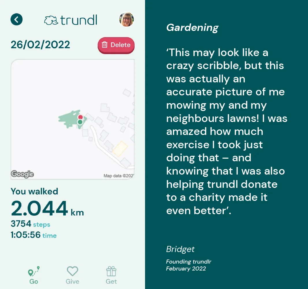 Whether it’s a trip to the shops, a short walk for rehab, a stroll with the dog or a hike in the hills, all steps with the trundl app add up for your health and towards good causes.